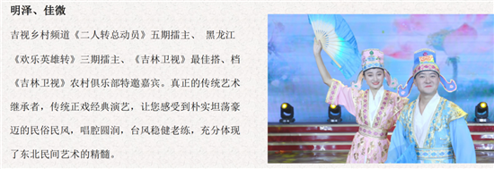 具体表演内容包括火爆的东北秧歌歌舞、二人转非遗经典剧目、曲艺坐唱大联欢、 二人转单口脱口秀、二人转扇子手绢精彩绝活等等。用极具地方特色的创作理念和表演方法,舞台样式上多以辽北标志性文化品牌为主,音乐上以东北民间音乐为主流。从作品的题材和内容以及人物形象的塑造,可以处处看出辽北的文化风俗及辽北人的性格和喜好,彰显出纯正浓厚的地域文化的和新时代下奋发向上的人文风貌。